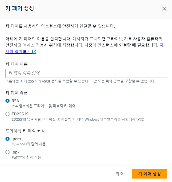 키 페어 이름을 만들어 줍시다. 저는 ToyServerKey라고 지어 보겠습니다. 아래의 옵션은 잘 모르시면 그대로 두고 "키 페어 생성"을 눌러 줍시다. 그러면 하단에 ToyServerKey.pem이라는 파일이 자동으로 다운로드됩니다.