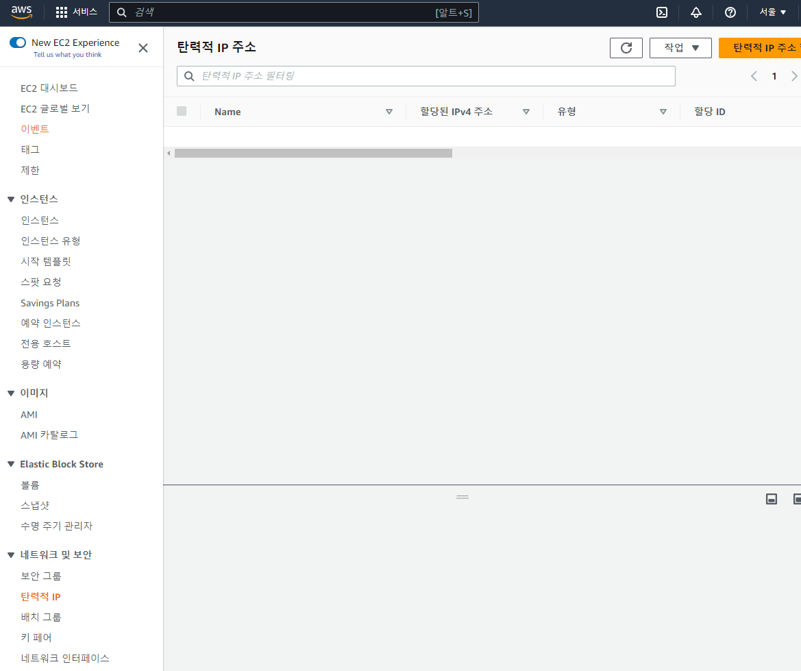 EC2 화면에 오면 좌측 밑에 "네트워크 및 보안 > 탄력적 IP" 메뉴를 확인 해 볼 수 있습니다. 들어가면 아무것도 없습니다.
