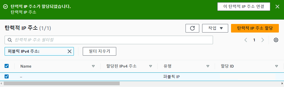 탄력적 주소를 할당 받았습니다!! (제 그림에서야 필터링 되었지만 여러분들은 xxx.xxx.xxx.xxx 로 된 퍼블릭 IPv4 주소를 받았을 것입니다.