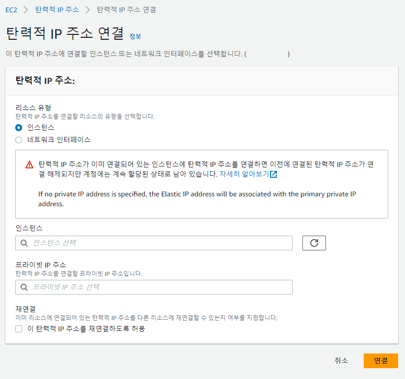 마침 위에 "이 탄력적 IP 주소 연결"이라 되어있네요. 이 의미는 다음과 같습니다.