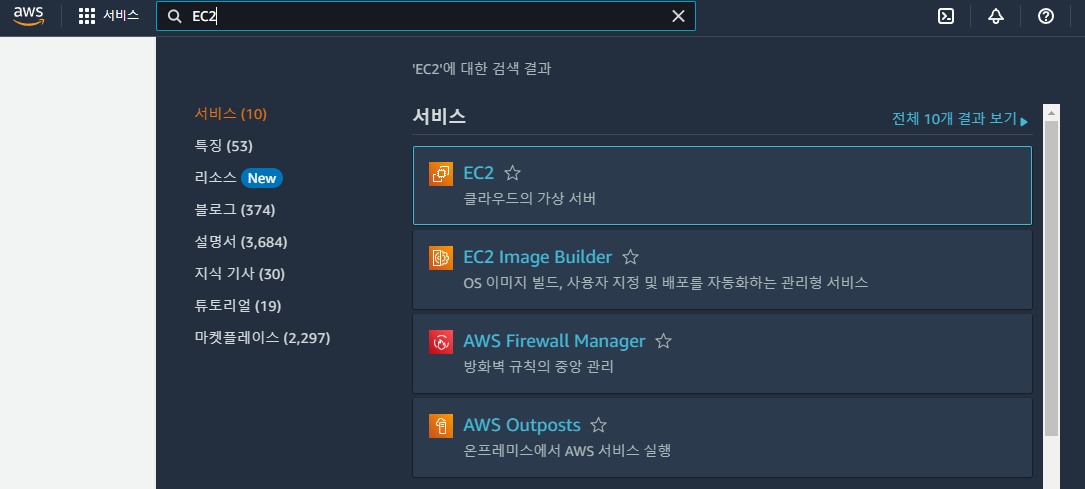 상단의 검색창에 EC2를 검색하면 다음과 같은 화면이 뜹니다. EC2를 클릭해 줍시다.