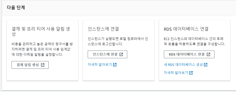 이제 인스턴스 생성이 완료되었으니 연결해 보러 가봅시다. 중간에 인스턴스에 연결 버튼을 클릭합시다.