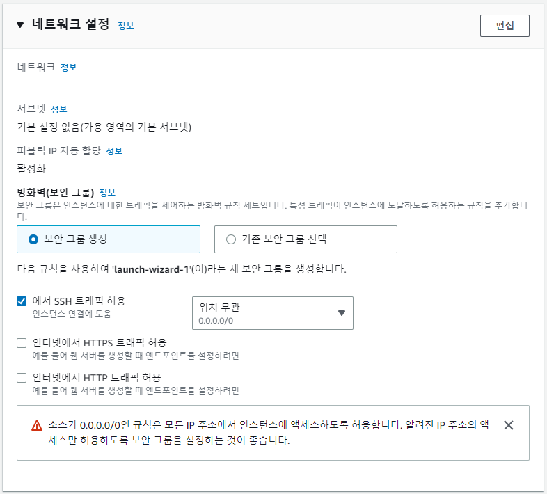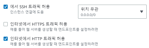저는 간단 Test를 위해 인스턴스를 만드는 것이므로 간단하게 보안 그룹을 설정하겠습니다.