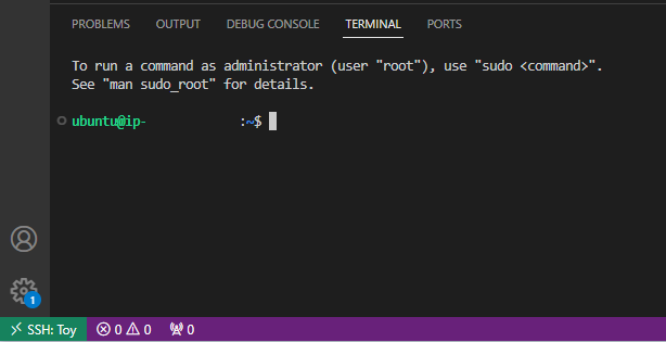 그리고 시간이 지나면... 좌측 하단에 SSH: Toy로 표시된 것을 확인해 볼 수 있습니다!!