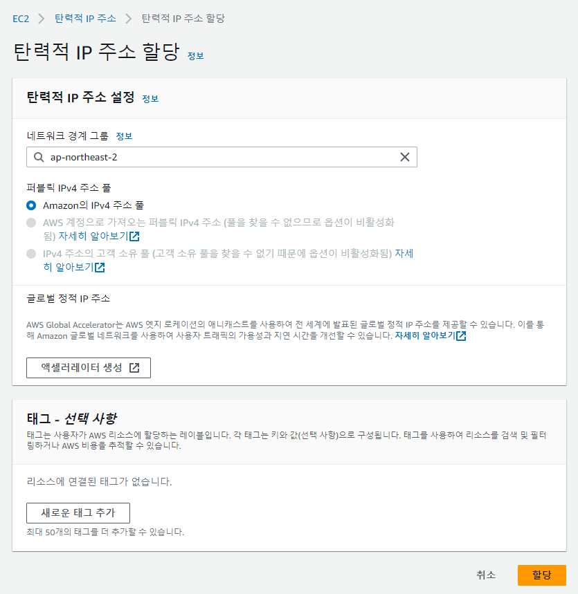 클릭하면 탄력적 IP 주소 할당을 위해 여러가지 옵션이 있습니다. 잘 모르겠으면 무시하고 우측 하단의 할당 버튼을 클릭합시다.