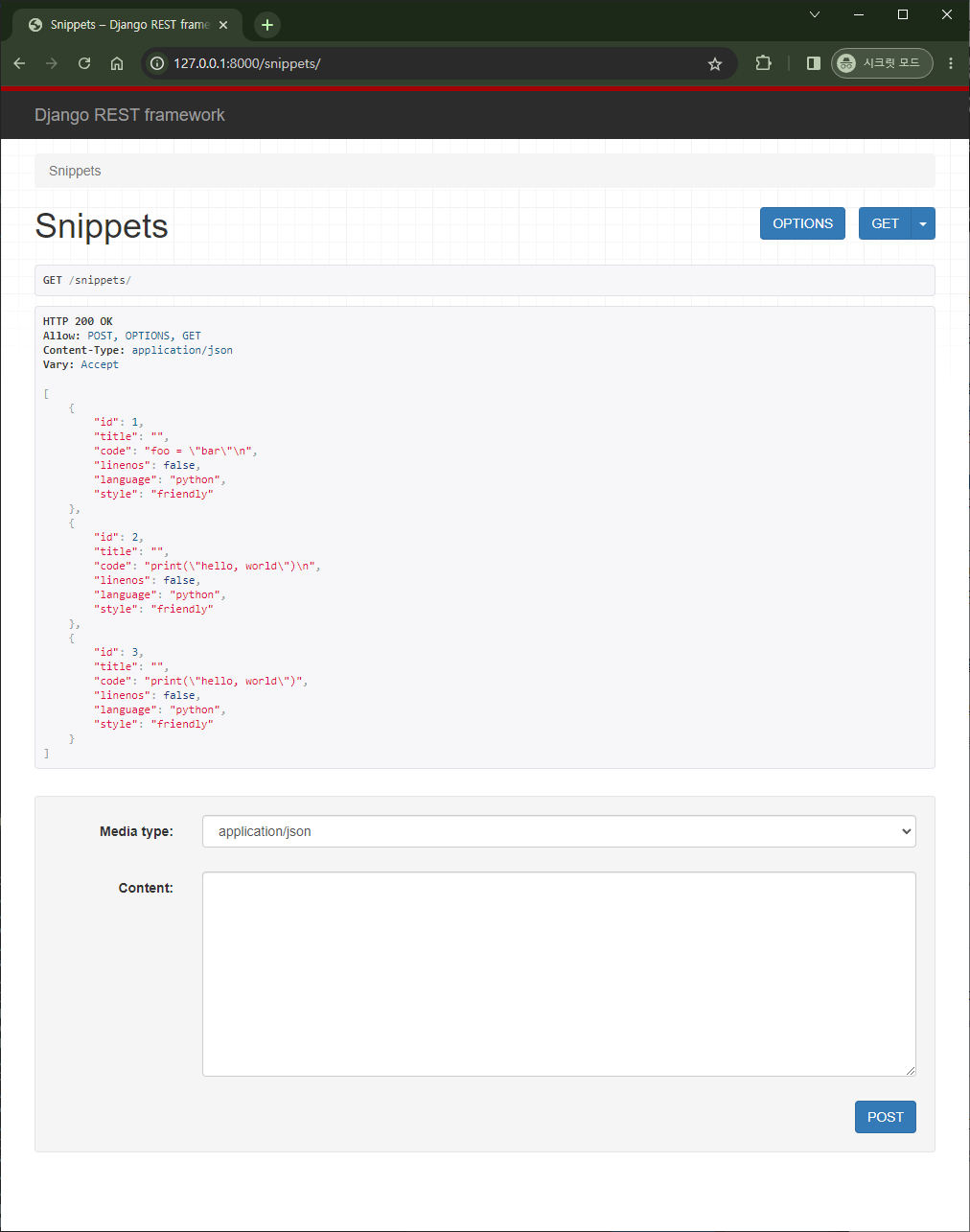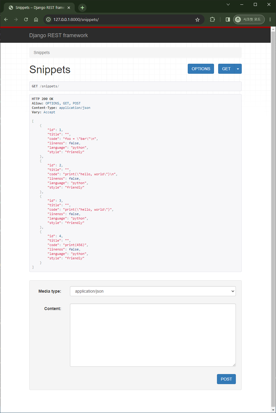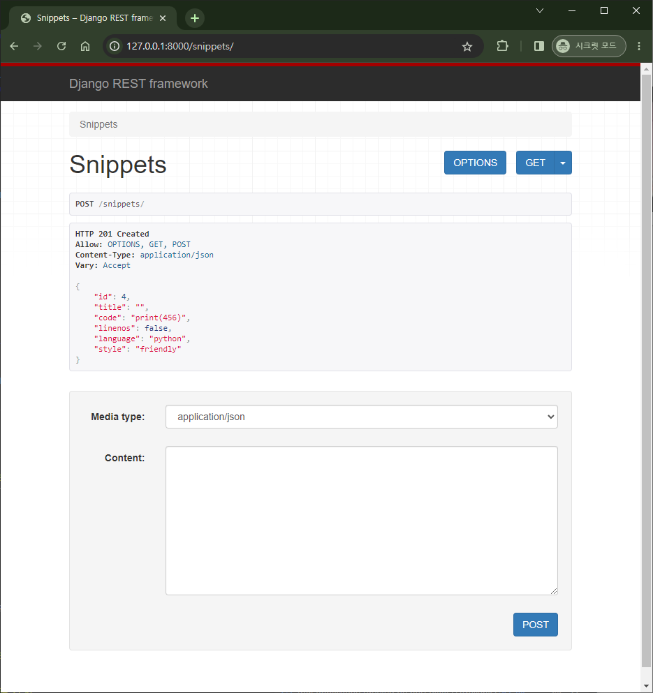POST request도 한 번 날려보겠습니다. rest framework에서는 Browser에서 POST를 날릴 수 있습니다.