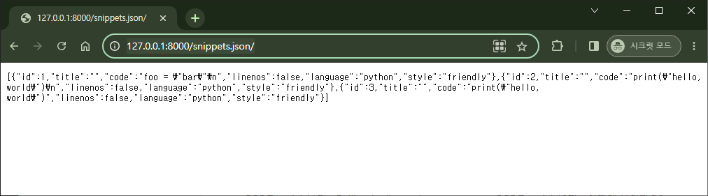 format_suffix_patterns를 추가하고, views에 format=None을 설정한 덕분에 json url도 가능합니다.