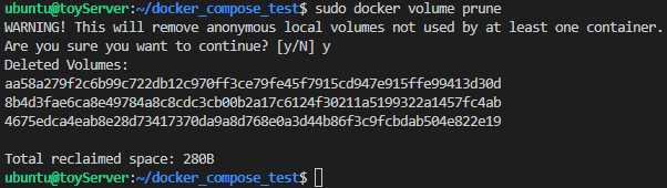 남아있는 volume은 아마도 기존에 container를 삭제하면서 같이 지워지지 않은 volume일 것입니다. 사용 중이지 않은 volume을 삭제하는 docker volume prune 명령어를 입력합니다.