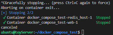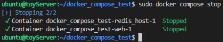 만약 daemon으로 돌아가는 compose application을 멈추고 싶다면 docker compose stop을 입력하면 됩니다.