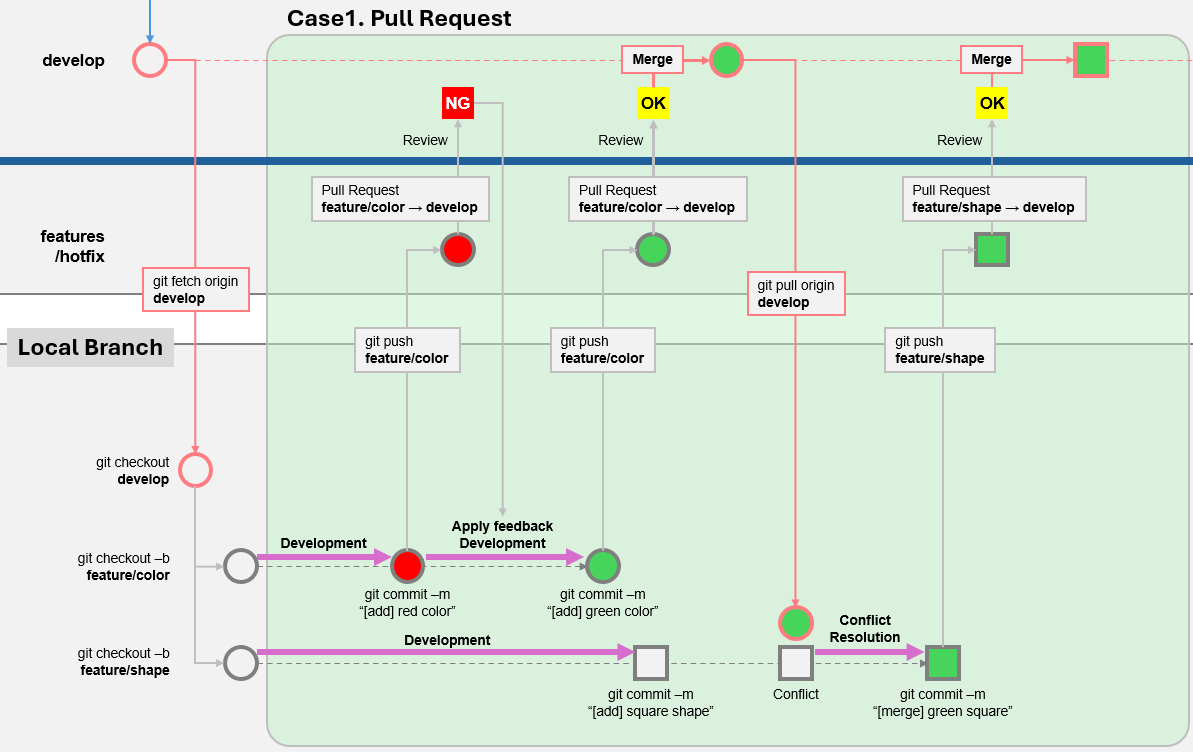 개발은 개발자마다 각각 다른 기능들을 개발하기 때문에 이 코드들이 merge되었을 때 높은 품질을 유지하기 위해서는 develop에 merge하기 전 review를 잘 해야 합니다. 그렇기 때문에 git의 전략에서 제일 중요한 것은 Pull Request 관리입니다. 그래서 Case1에 대한 제목을 Pull Request라고 했습니다.