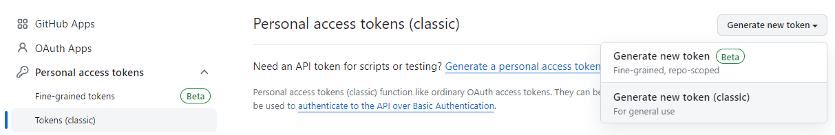 Personal access tokens를 클릭합니다. 그리고 Tokens (classic)을 클릭합니다. 그리고 우측 상단에 Generate new token을 클릭합니다. (Fine-grained tokens는 현재(2024-02-13) beta이므로 나중에 정식 version이 release되면 사용해 보도록 합니다)