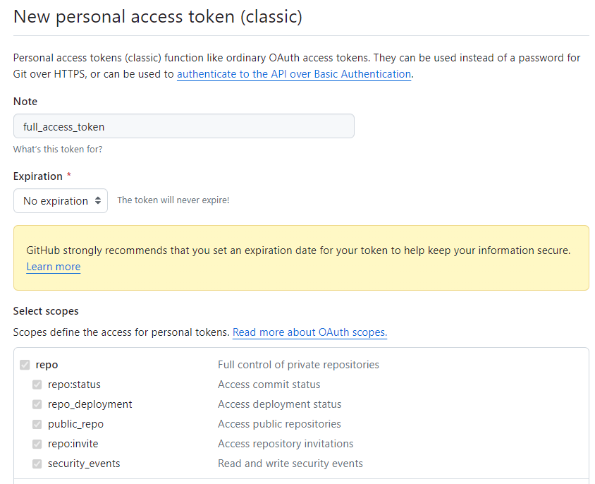 그러면 token을 생성할 수 있는 화면을 볼 수 있습니다. 이번 예제에서는 권한, 보안에 대해서 자세한 설정은 진행하지 않기 때문에 full access token을 유효기간 무제한으로 만들어 주도록 합시다.