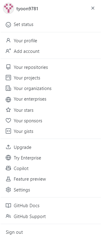 먼저 github login을 진행한 후 profile을 클릭합니다. 이 메뉴들 중에 Settings를 클릭합니다.