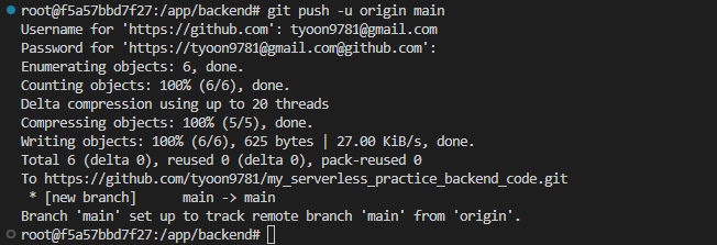 그리고 password에는 이전에 발급받은 token값을 입력해 봅시다. 그러면 이제 git push에 필요한 인증정보를 입력할 수 있습니다.