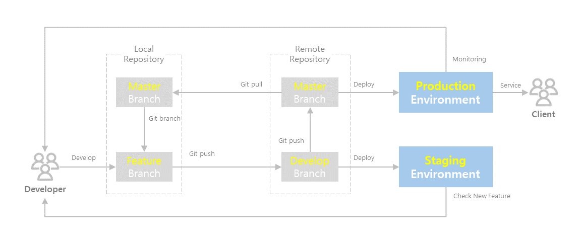 - 개발자는 신기능 개발을 위해 git pull로 Master Branch에서 본인의 Feature branch를 만듭니다.