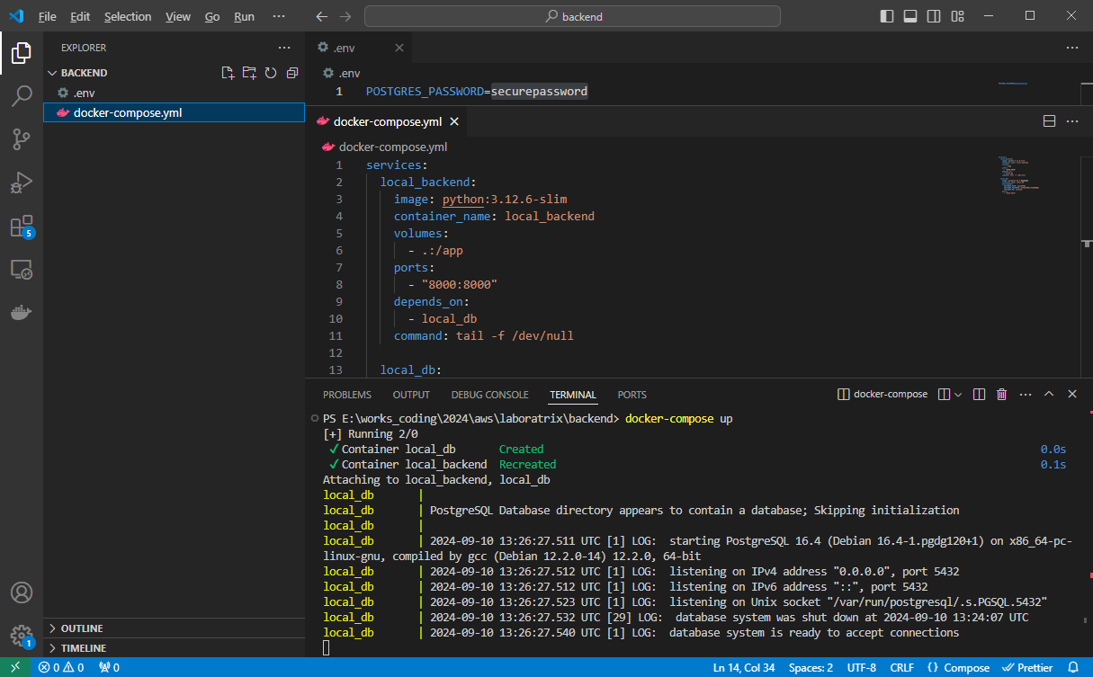 여기서 Backend Container를 만들 docker-compose.yml 파일을 만들도록 하겠습니다. python container와 postgres container를 각각 만듭니다.