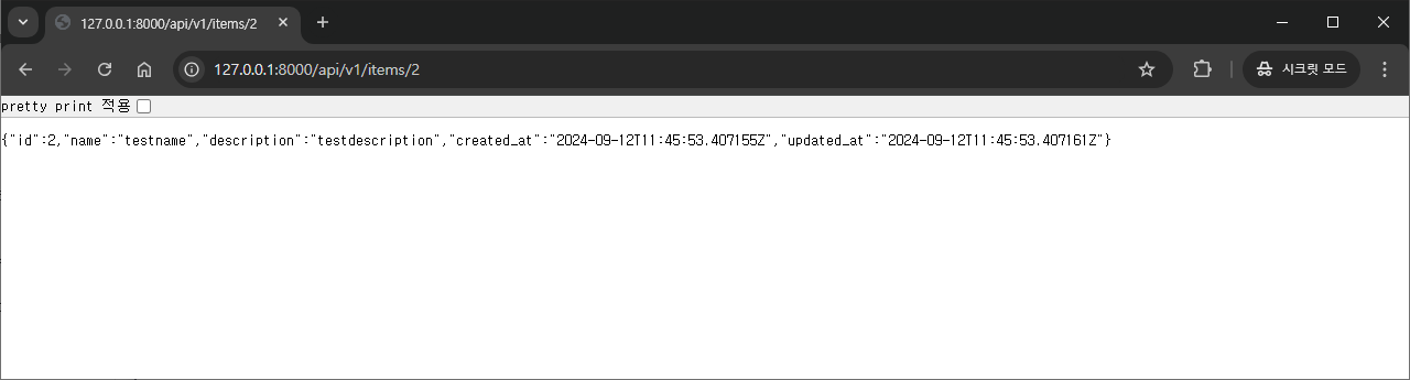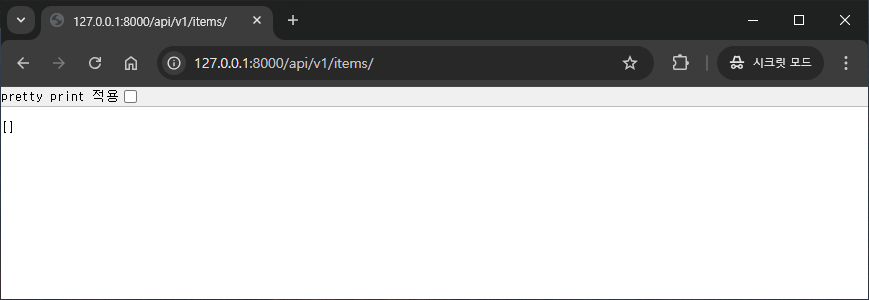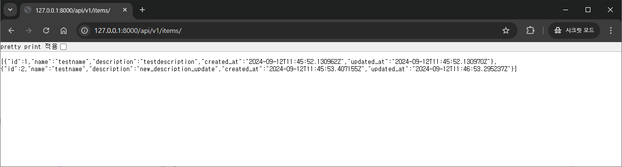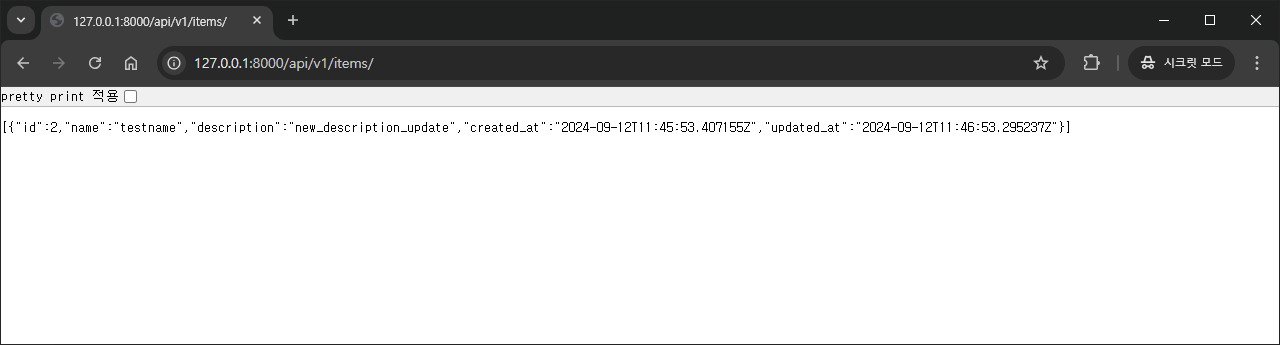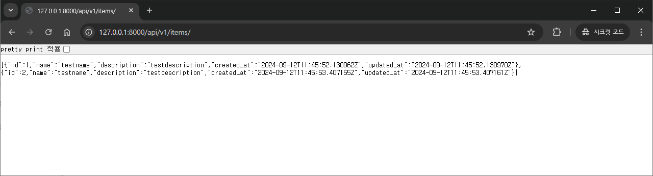 이제 다시 items를 조회해보면 추가한 Item이 잘 출력되는 것을 확인할 수 있습니다.