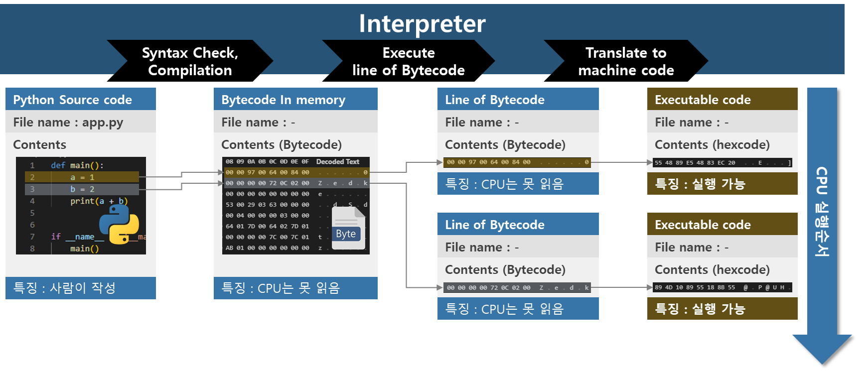 그럼 파이썬 인터프리터는 어떻게 동작할까요? 그림과 함께 살펴봅시다.