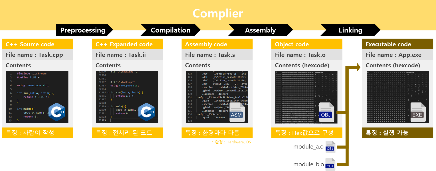 C++의 Compiler인 g++를 예시로 하여 그림으로 표현해 보았습니다. 한 단계씩 설명해 보겠습니다.