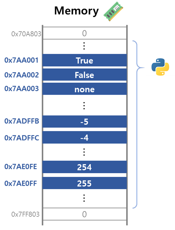 파이썬은 여기서 멈추지 않고, -5 ~ 256까지 미리 메모리에 할당하여, 변수가 해당 범위 내에서 선언되면, 추가적인 메모리 주소를 사용하는 것이 아닌, 파이썬이 기존에 잡아놓은 메모리를 사용하게 합니다. 예를 들어, 값 1을 가진 변수 100개를 선언한다면, python integer(28byte)를 100번 할당하는 것이 아니라, address(8byte)만 100번 할당하게 되어 메모리공간을 효율적으로 사용할 수 있습니다.