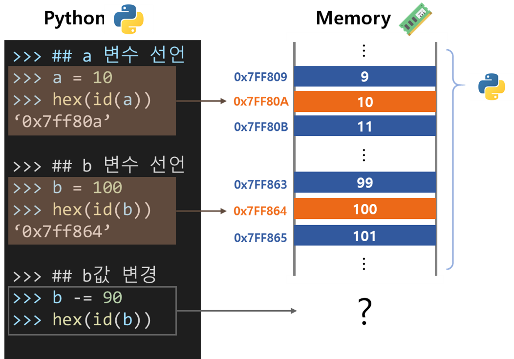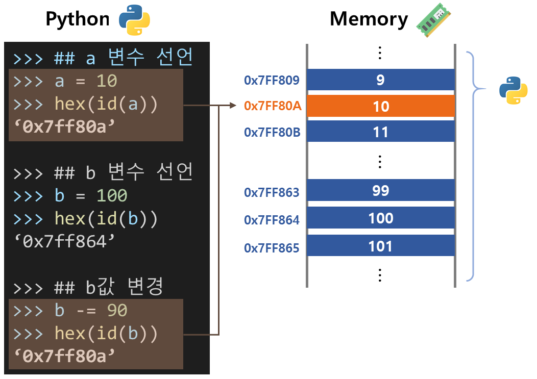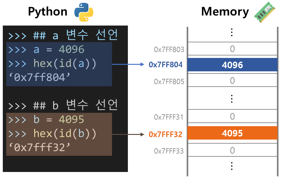 메모리에는 저장할 수 있는 공간마다 주소가 있고, 그 공간에 데이터를 담을 수 있습니다. id() 함수는 python에서 변수의 저장된 주소를 확인할 수 있는 함수입니다. 이 함수를 사용해서 a와 b의 저장된 주소를 확인할 수 있습니다.