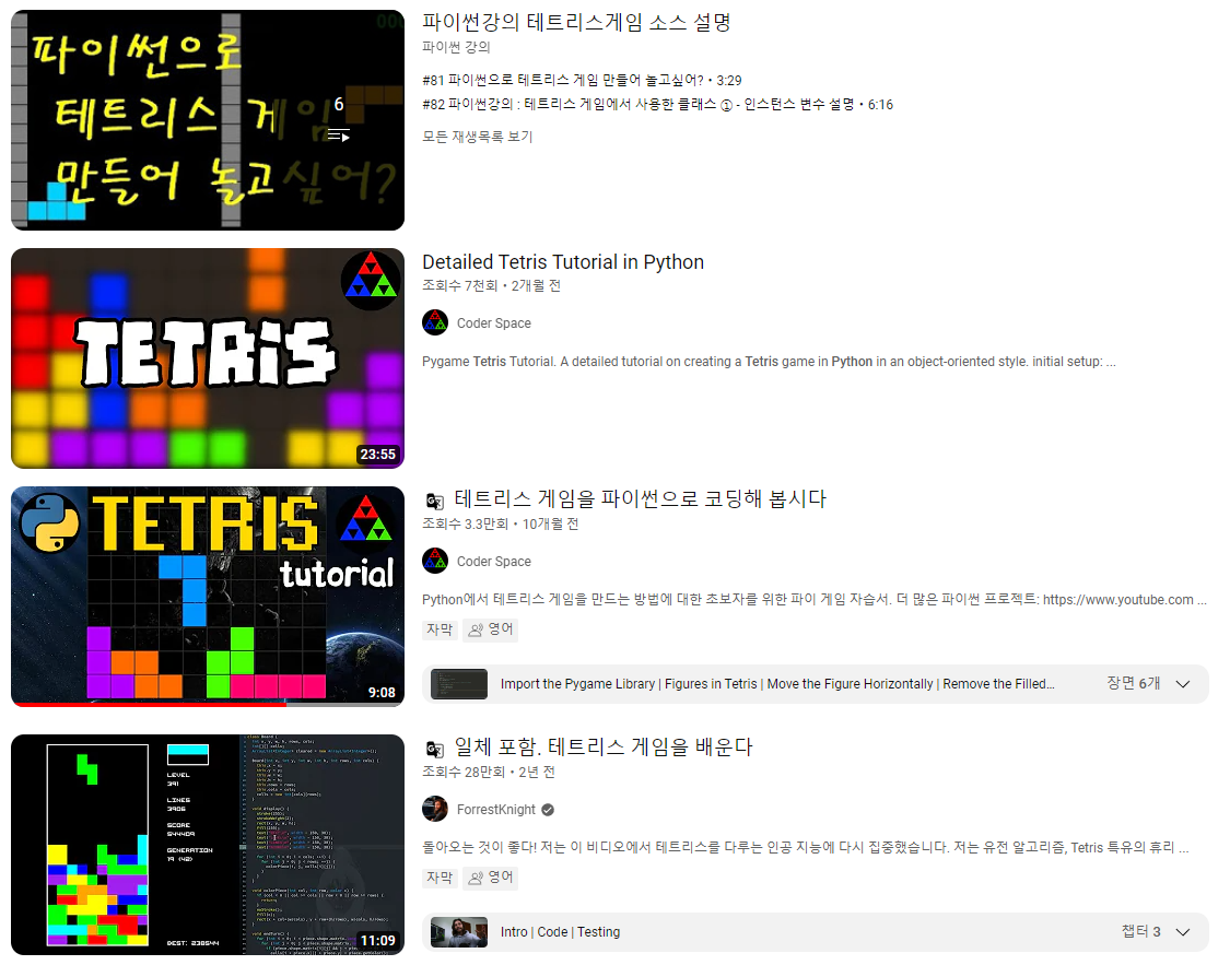 사실, 인터넷에 "python tetris"라고 검색하면 이미 잘 되어 있는 코드가 널려있습니다. 필자는 왜 잘된 코드를 만들어서 설명하지 않을까요?