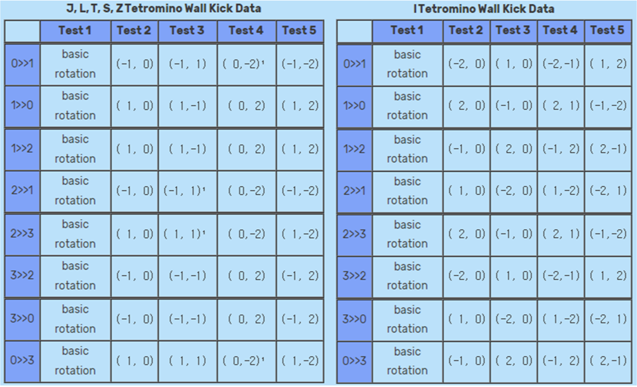 - Wall kick : 회전을 시도할 때 벽이나 바닥, 또는 블럭에 막히면 tetromino를 근처의 다른 위치로 이동을 시도합니다.
