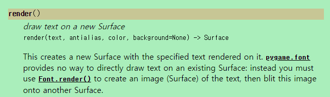 pygame.font.Font.render에 들어가면 다음과 같은 정보를 확인할 수 있습니다.
