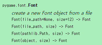 System Font는 제 컴퓨터에 있는 Font를 활용해서 Font Object를 생성하고, Font는 file로 지정해서 Font Object를 생성하는 것입니다. 저는 특별한 Font를 사용할 계획이 없으므로, Font Style을 None으로 설정할 수 있는 pg.font.Font()를 사용해 보겠습니다