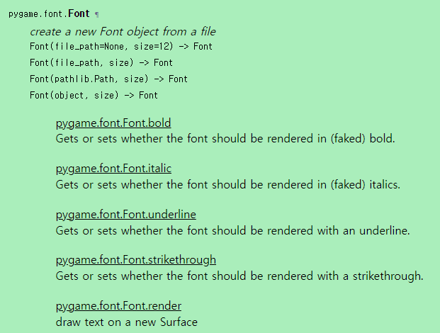 pygame.font.Font.render에 들어가면 다음과 같은 정보를 확인할 수 있습니다.