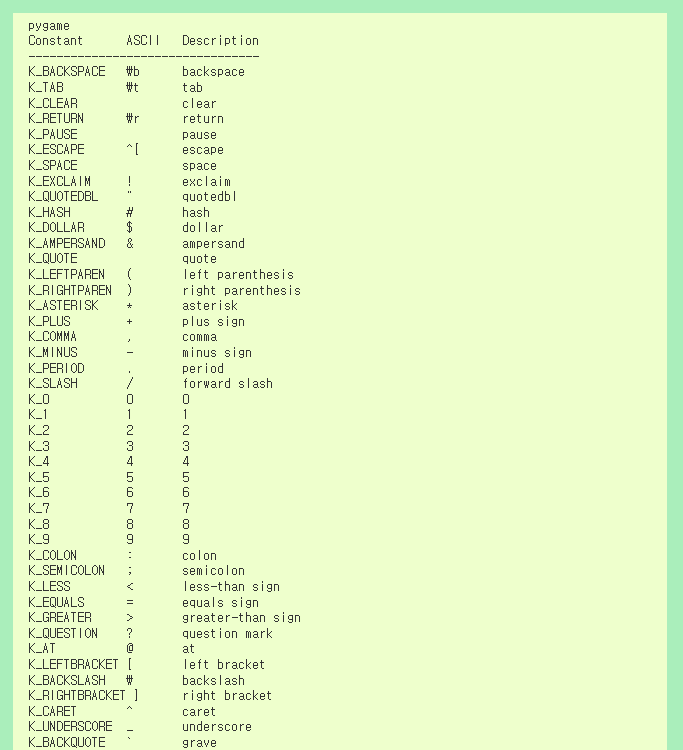 하지만 아직 문제가 남아있습니다. Unicode만 표시하도록 했더니, ctrl, space, 화살표 key는 표시가 안됩니다. 이러한 것들은 pygame에서 key mapping에 따라 수동으로 표현하도록 합시다.