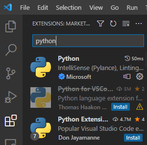 vscode에서 python을 쉽게 사용하려면 python extension을 설치하는 것이 좋습니다. 좌측의 메뉴 중 4개의 사각형으로 이우러진 아이콘을 클릭하고 python을 검색하여 설치합시다. (Microsoft 인증 마크가 있는 것 설치)