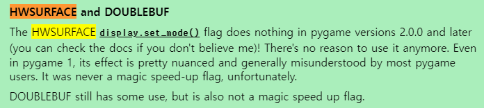 ## pygame.HWSURFACE와 pygame.DOUBLEBUF의 의미를 아직 모른다.