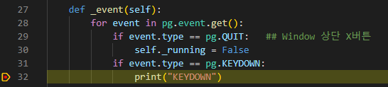 if event.type == pg.QUIT:   ## Window 상단 X버튼