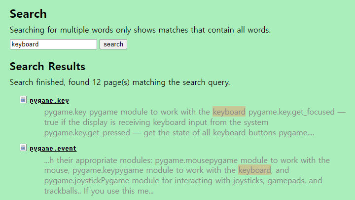 확인해 보니 pygame에서 event는 quene 형태로 관리된다고 합니다. 하지만 여기서 실질적으로 어떻게 또 다른 정보를 찾기 어렵습니다. keyboard의 값을 pygame.event.get()은 어떻게 처리를 하는 것일까요? 공식문서에서 keyboard로 검색해 보았습니다.