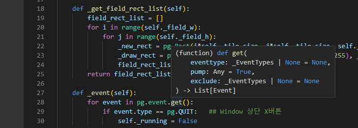 키보드의 입력값을 받는 것처럼 보이는 pygame.event.get()이 어떤 함수인지 살펴보았습니다.