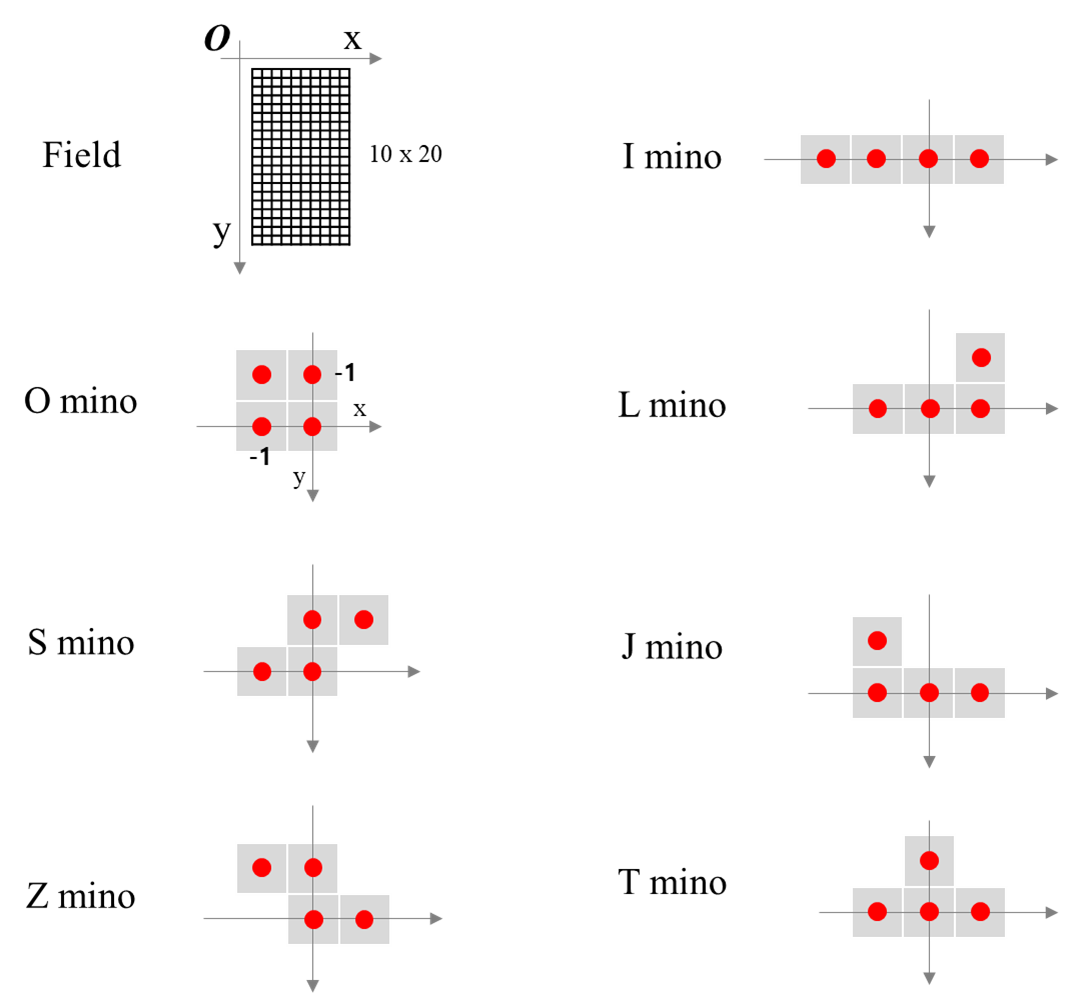 이번에는 미노가 처음 나왔을 때의 위치 지정, 그리고 Field를 나가지 않도록 경계조건(boundary condition)을 만들어 보도록 합시다.