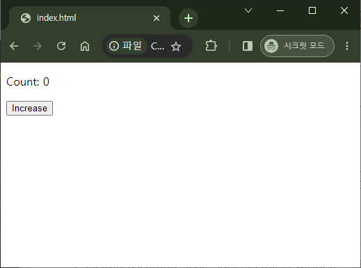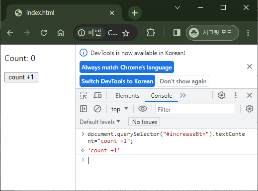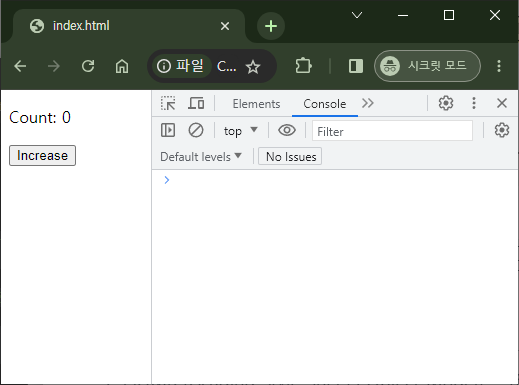 이 상태에서 버튼을 누르면 Count가 올라가는 것을 확인할 수 있습니다. 그런데 저는 Increase라는 버튼에 있는 글자를 Count +1이라는 글자로 바꾸고 싶습니다. 그럴 때는 어떻게 해야 할까요? 이때 들어가는 기술이 바로 DOM control입니다. HTML에 있던 각각의 Object(tag)를 조회, 수정하여 DOM을 control 해 봅시다. 먼저 F12를 눌러 개발자 도구를 엽니다.