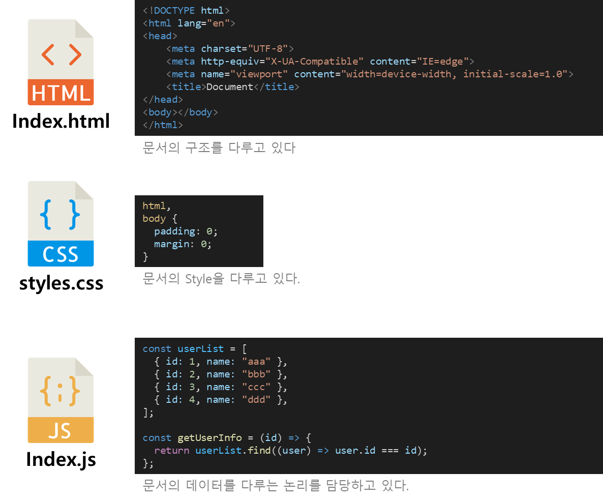react가 있기 전에는 주로 html + css + javascript로 웹 개발을 진행했습니다. 각각의 요소는 기능별로 분리가 되었습니다.
