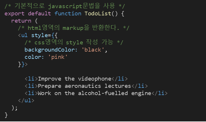 JSX 문법의 가장 큰 특징은 html과 javascript를 결합한 형태라는 것입니다. 물론 html에서 style을 통해 css를 부분적으로 작성했던 것까지 JSX에서는 가능합니다. 이전에는 3가지 파일로 나눠서 작성했던 것이 하나의 파일로 작성이 가능하게 된 것입니다. 이렇게 바뀌면서 생긴 가장 큰 특징은 html의 tag를 javascript의 문법으로 다룰 수 있게 되었다는 것이며, 이는 조건에 따라 contents 구조를 바꾸거나, 반복문을 실행하여 가변적 길이의 contents 나열을 쉽게 구현할 수 있는 등, 다양한 contents viewing 방식을 javascript로 편하게 control 할 수 있게 되었습니다. 이런 contents 단위를 Component라고 합니다. Component 단위의 웹 개발은 html + css + javascript과 비교했을 때 반복적인 부분을 줄여줌과 동시에 개발 속도와 관리 측면에서 매우 유리합니다.