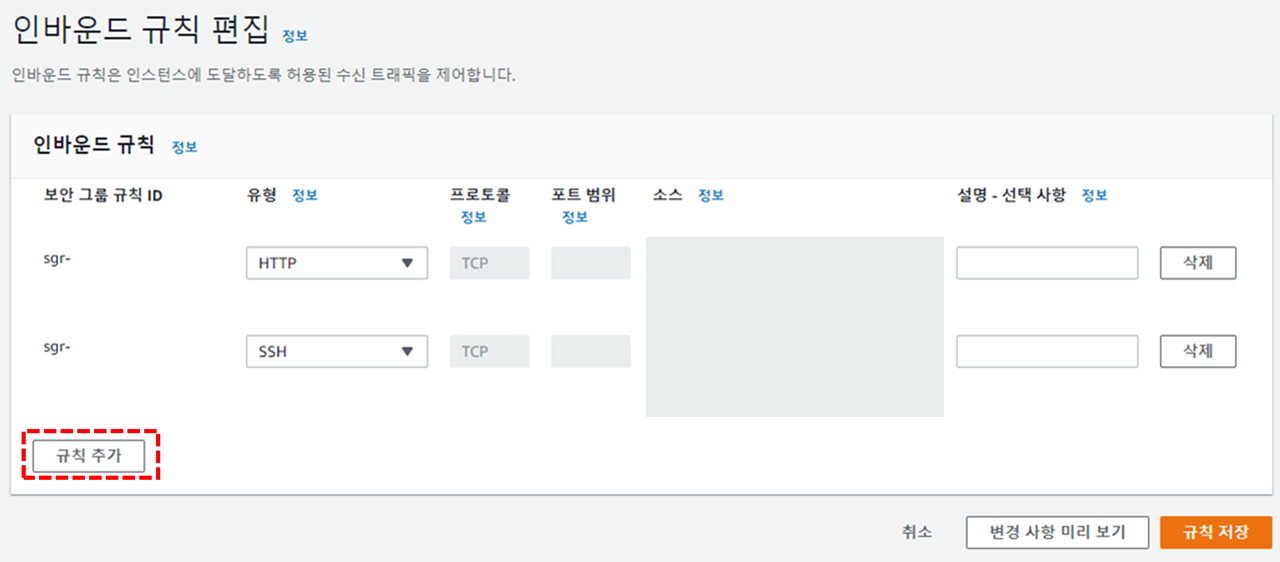 클릭하면 보안 규칙을 확인할 수 있습니다. 우측의 인바운드 규칙 편집을 클릭합시다.