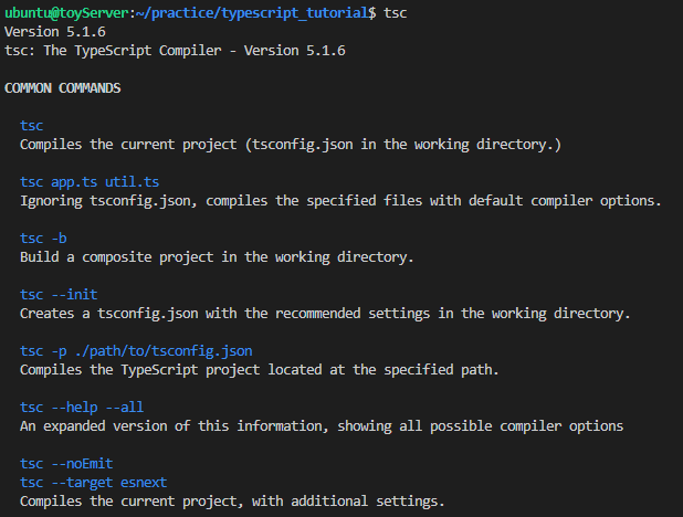 설치가 완료되었으면 tsc를 입력해 보도록 합시다. 아래와 같이 command 목록이 뜬다면 설치가 성공적으로 된 것입니다. 이제 예제를 실행해 보도록 합시다.