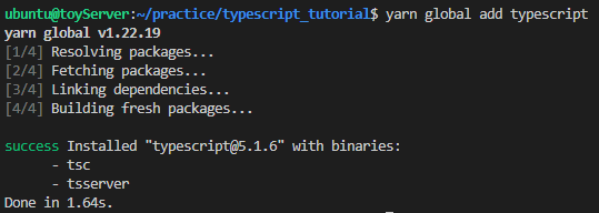 * 바쁘신 분들을 위한 빠른 설정 yarn config set prefix ~/.yarn-global yarn global add typescript echo 'export PATH="~/.yarn-global/bin:$PATH"' | tee -a ~/.bashrc source ~/.bashrc tsc * 환경은 ubuntu 기준으로 설명합니다. [실습] EC2