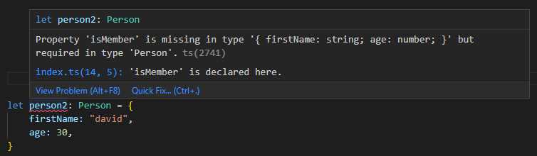 위의 구문에서 ?가 사용되었는데 이는 lastName이 없어도 괜찮다는 의미입니다. 하지만 나머지 (firstName, age, isMember)는 빠지지 않고 object에 포함되어 있어야 합니다. 만약 밑과 같이 작성하게 된다면 다음과 같은 에러를 확인할 수 있습니다.