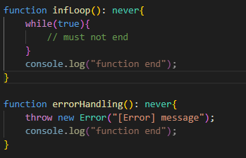함수가 아무것도 return하지 않아 void 형식을 지정하는 것과는 다르게 애초에 함수를 빠져나갈 수 없는 경우 Never를 사용합니다. vscode에서 함수 끝부분에 구문을 작성해 보면 더욱 어떤 의미인지 알 수 있습니다.