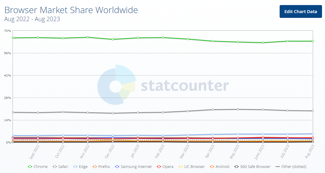 꽤 많은 시간이 흐르고, 현재는 다행히도 ECMA기관에서 JavaScript를 표준화(ECMAScript)를 추진하여 대부분 해당 표준을 따르고 있습니다. 그리고 이 표준을 따르는 Browser 중에서 Chrome Browser가 현재(2023-09-28) 점유율 1위를 차지하고 있습니다.