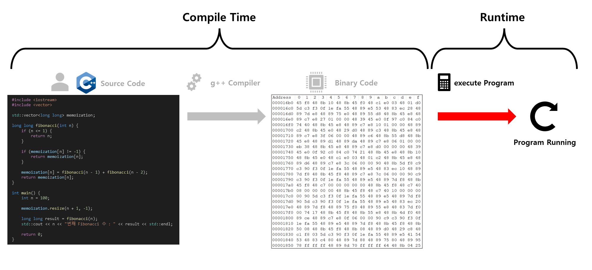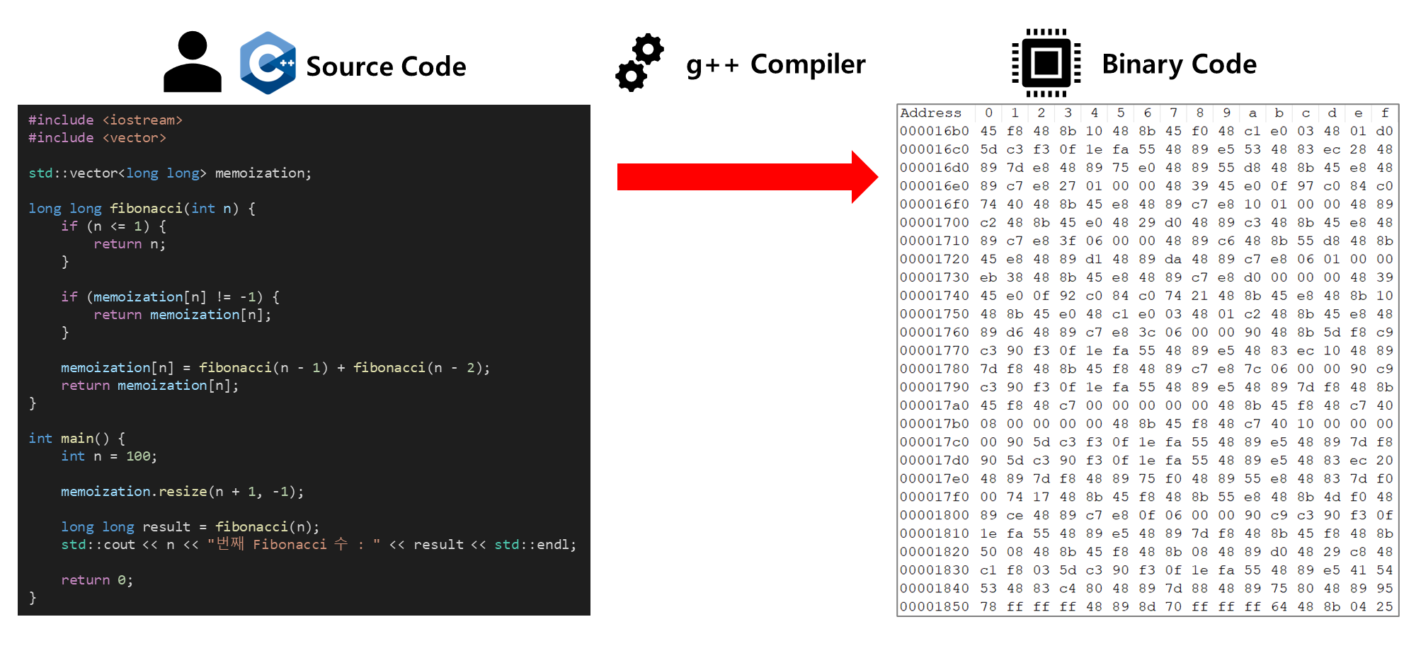 이 3가지를 이해한다면 Compile을 이해할 수 있습니다. 간단한 동작예시를 그림으로 그려보았습니다. 먼저 사람이 이해 할 수 있는 C++언어로 Fibonacci를 구하는 함수 코드를 작성합니다. 그 다음에는 g++ compiler가 동작하여 C++ Source Code를 기계가 이해하는 binary로 바꿔주는 모습입니다.