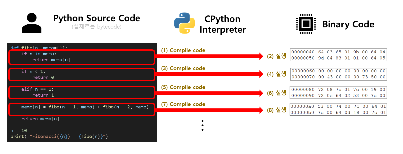 Python같은 경우는 어떨까요? Python은 Interpreter언어로 Compile 언어인 C++과는 다릅니다. Code 전체를 기계(예 : CPU)가 이해할 수 있는 Binary code로 Compile하지 않고 줄 단위로 Compile하여 실행합니다.